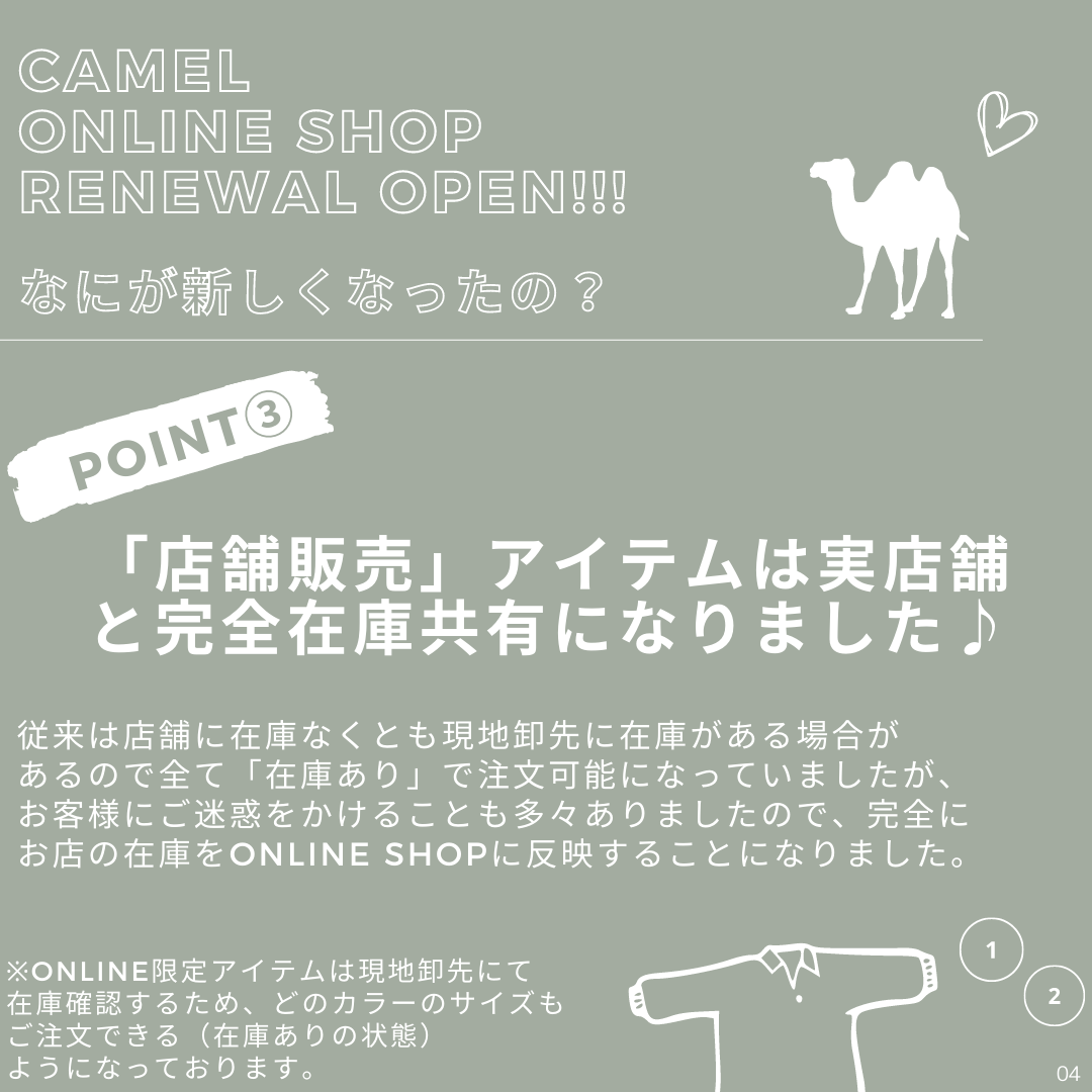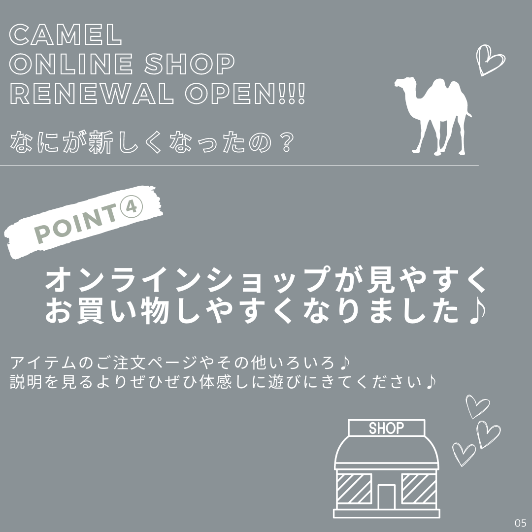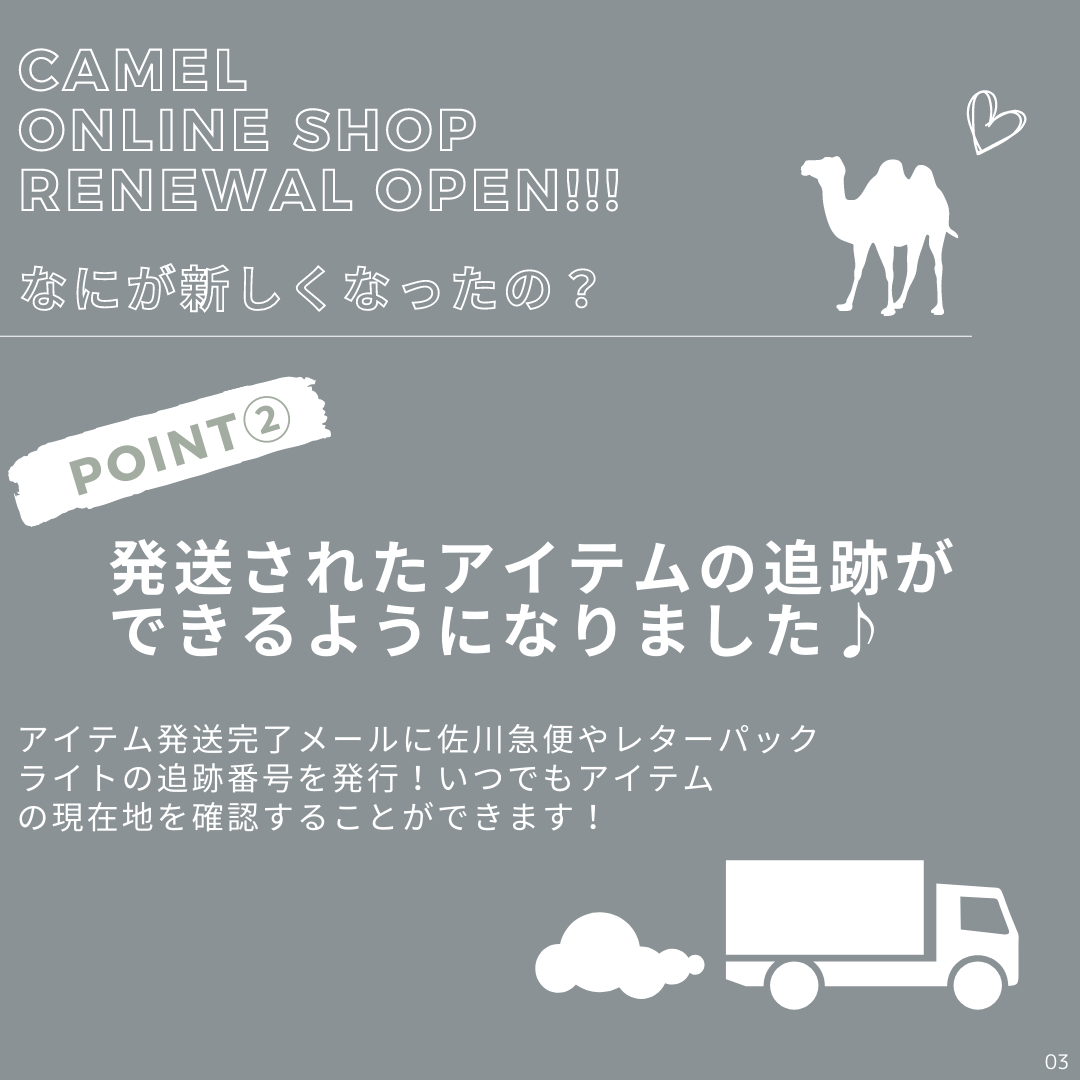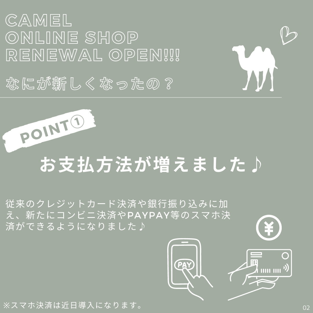 CamelのOnline Shopがリニューアルオープンしました!コンビニ決済やスマホ決済が新たなお支払方法として加わり、配送アイテムが追跡できるようになったりと、その他いろいろ、もっともっとお客様に快適にお買い物頂けるようリニューアルしました!